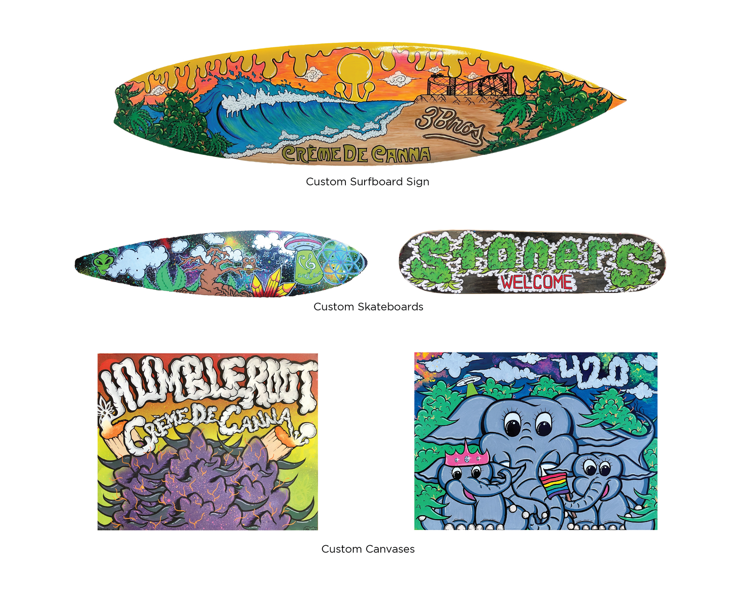 Bring your idea to life with a one-of-a-kind piece of artwork! Whether it's a canvas, skateboard, surfboard or sign, I'll create a vibrant and dynamic piece of art to adorn your wall or transform your ride into a mobile masterpiece.